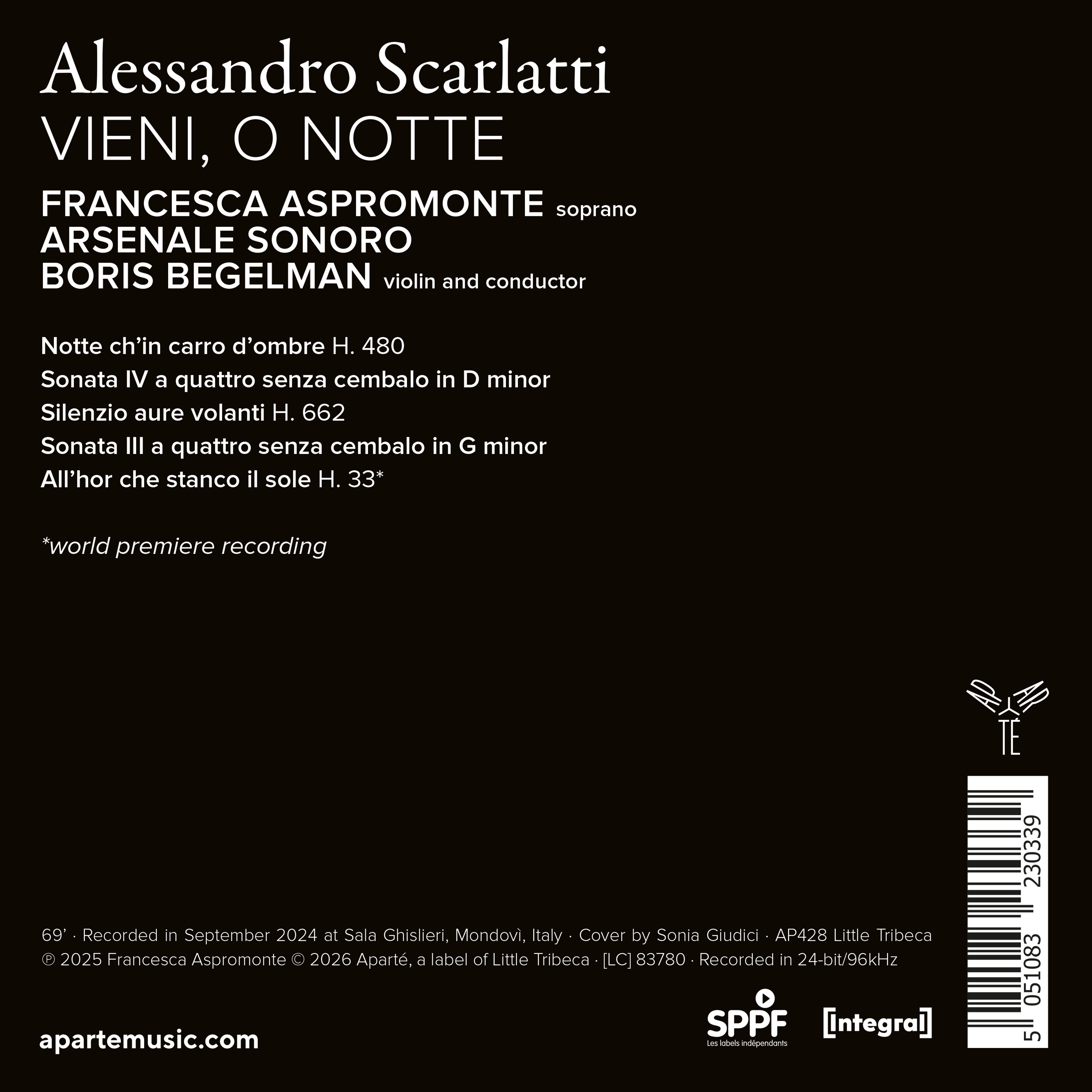With 'Vieni, o Notte', Francesca Aspromonte signs her first recording for Aparté with an all-Scarlatti programme. Together with Arsenale Sonoro and Boris Begelman, she explores three cantatas (sometimes described as serenate) in which the composer makes the night the stage for his characters’ thwarted loves. He gives them arias and recitatives that are painful, contemplative, or searing, complemented by two sonate a quattro with madrigalian lines, whose quartet performance by Arsenale Sonoro highlights the bold harmonic shifts, the shadows, and the light.