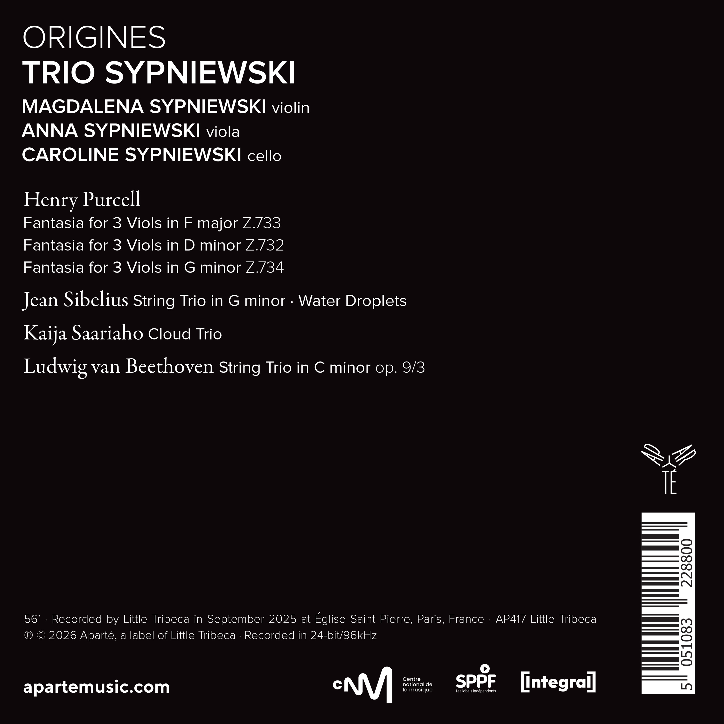 Born in 2016, the Sypniewski Trio brings together Magdalena, Anna and Caroline Sypniewski. For “Origines”, their first album, the three sisters return both to the birth of the string trio and to the origins of their own ensemble. The programme includes Purcell’s fantasias for viols – intimate pieces enriched by the musicians’ historically informed performance practice – alongside trios by Sibelius and Beethoven (the third of the Op. 9 set, the most ardent and innovative of his works in the genre), as well as Kaija Saariaho’s intense Cloud Trio. These varied musical landscapes offer the Sypniewski sisters the opportunity to play with virtuosity on the paradox of the trio format, where individuality and cohesion serve a single musical narrative, which they shape with precision and poetry in a spirit of total commitment.
