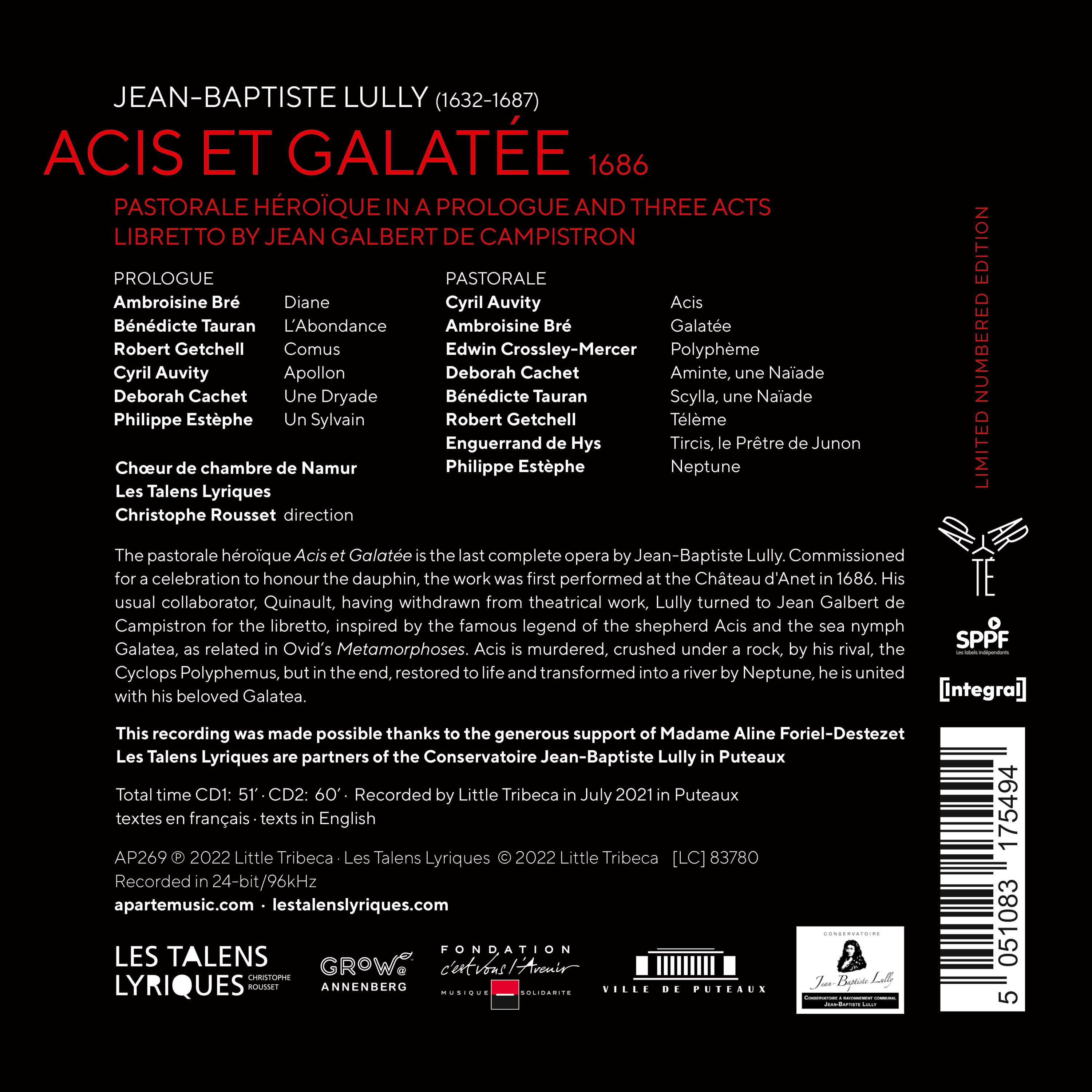 Composée en 1686 à l'intention des festivités données par le duc de Vendôme en l'honneur de la visite du Grand Dauphin dans sa propriété du château d'Anet, Acis et Galatée est la dernière œuvre achevée de Lully. Narrant les amours du berger Acis et de la déesse Galatée, fille de Nérée, poursuivis par l'ire du cyclope Polyphème épris de la néréide, l'œuvre signe la première collaboration de Lully avec le librettiste Campistron, après le retrait de la scène de son fidèle collaborateur Quinault.