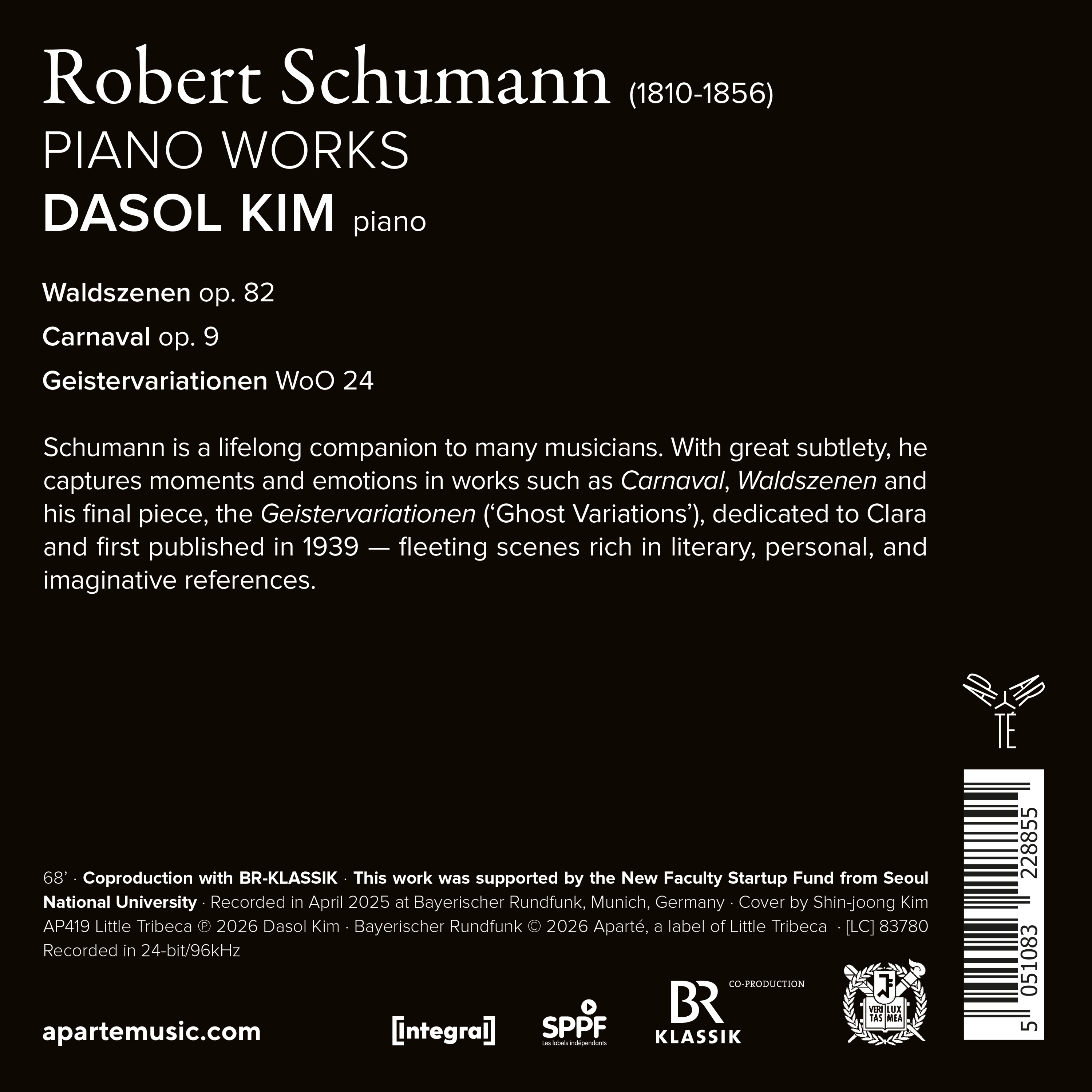 Schumann est l’un des grands compagnons de route des musiciens, et il en va de même pour Dasol Kim. Le compositeur parvient à capturer, avec beaucoup de finesse, les moments ou émotions fugaces et marquants de l'existence. Son Carnaval, les Scènes de la forêt ou sa dernière composition, les Geistervariationen, “variations des esprits” dédiées à Clara et publiées pour la première fois en 1939, comptent de multiples références à l’imaginaire populaire, la littérature, la vie de Schumann ou ses réflexions, que Dasol Kim explore ici.