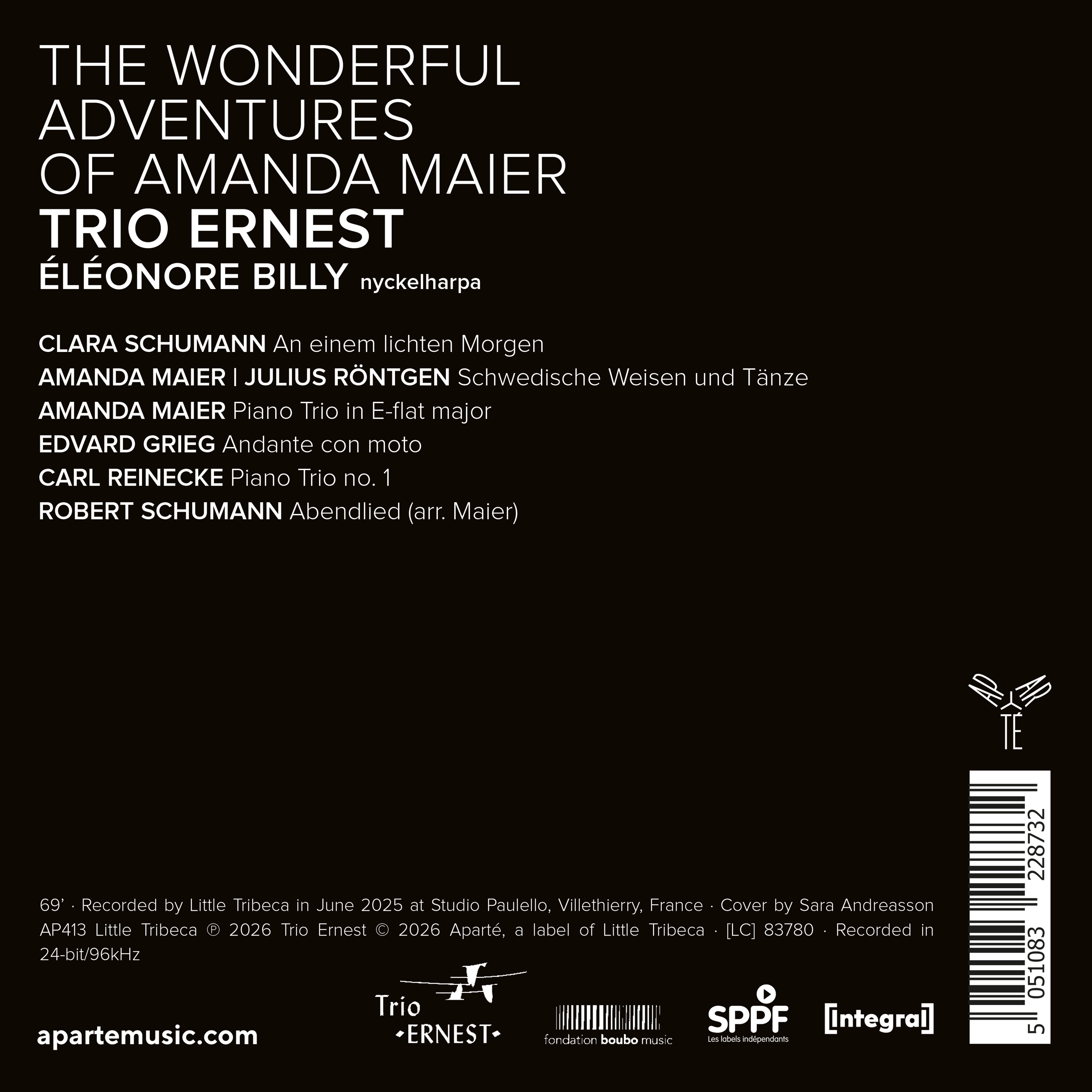 Avec cet album, le Trio Ernest fait renaître l’univers d’Amanda Maier, où son Trio en mi bémol, entre romantisme allemand et folklore suédois, dialogue avec Grieg, les Schumann, Reinecke et les couleurs singulières de la nyckelharpa d’Éléonore Billy.