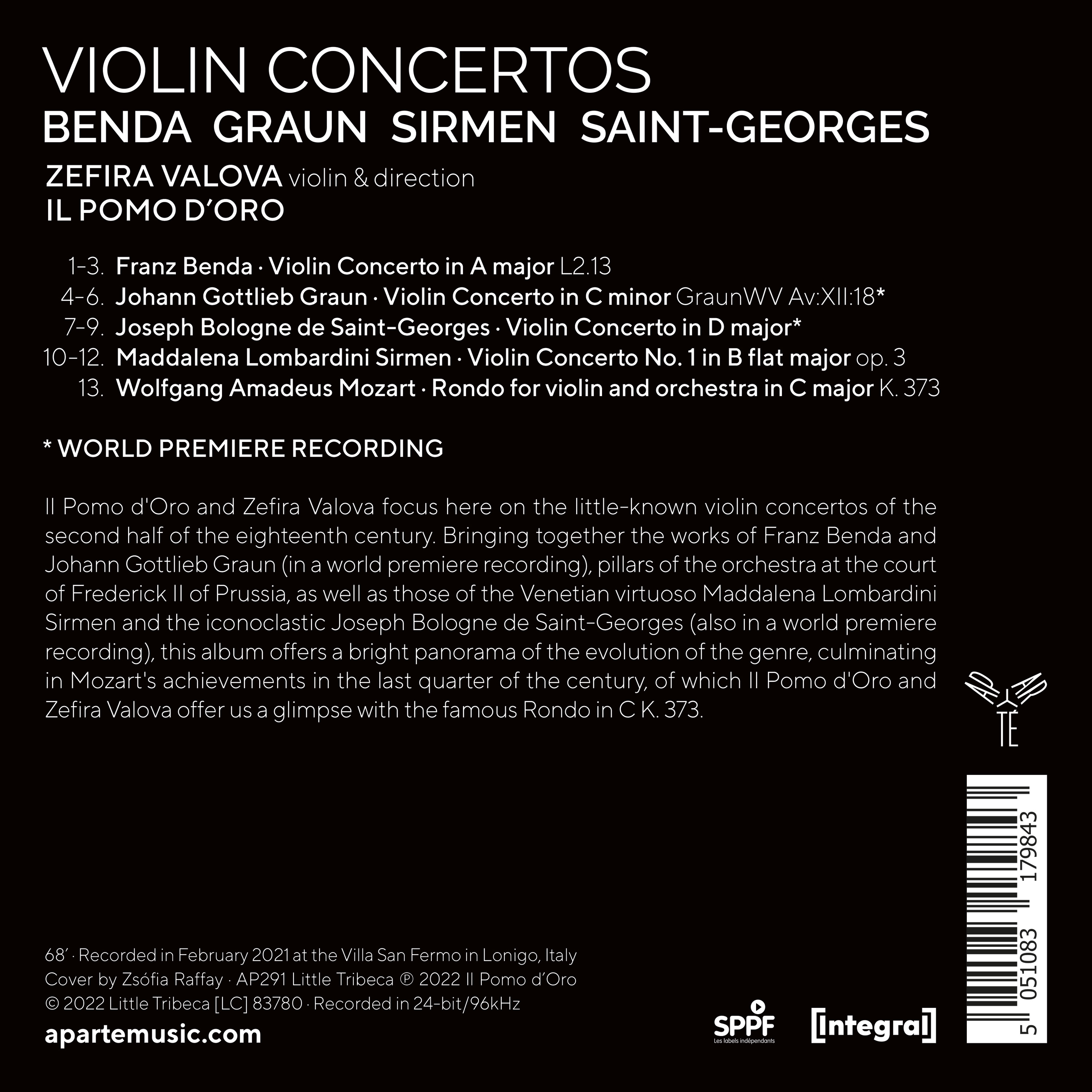 Il Pomo d’Oro et Zefira Valova s’intéressent ici aux concertos pour violon méconnus de la seconde moitié du XVIIIe siècle. Réunissant les oeuvres de Franz Benda et de Johann Gottlieb Graun (en premier enregistrement mondial), piliers de l’orchestre à la cour de Frédéric II de Prusse, ainsi que celles de la virtuose vénitienne Maddalena Lombardini Sirmen et du très iconoclaste Joseph Bologne de Saint-Georges (également en première mondiale), cet album offre un panorama de l’évolution du genre, amenée à aboutir sur les réalisations de Mozart dans le dernier quart du siècle, et dont Il Pomo d’Oro et Zefira Valova nous offrent un aperçu avec le célébrissime Rondo en do K.373.